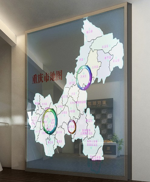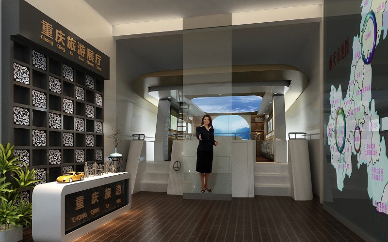 旅游展厅设计主要突出是展示城市旅游文化的重要窗口,重庆三峡博物馆是以六大旅游精品为核心的重庆旅游及独特的巴渝文化展示平台,以高科技多媒体形式为主要手法的全方位综合立体展示应用。整体设计以简洁现代的装修风格、虚拟现实的身临体验、空间结构的合理性、营造出巴渝文化的独特节奏感,并注重各部分的内容衔接与呼应,使之参观目的更加清晰明了。展厅由五个功能区组成,即:旅游接待台、重庆旅游地图、虚拟导游、时空隧道、巴渝漫游4d影院。