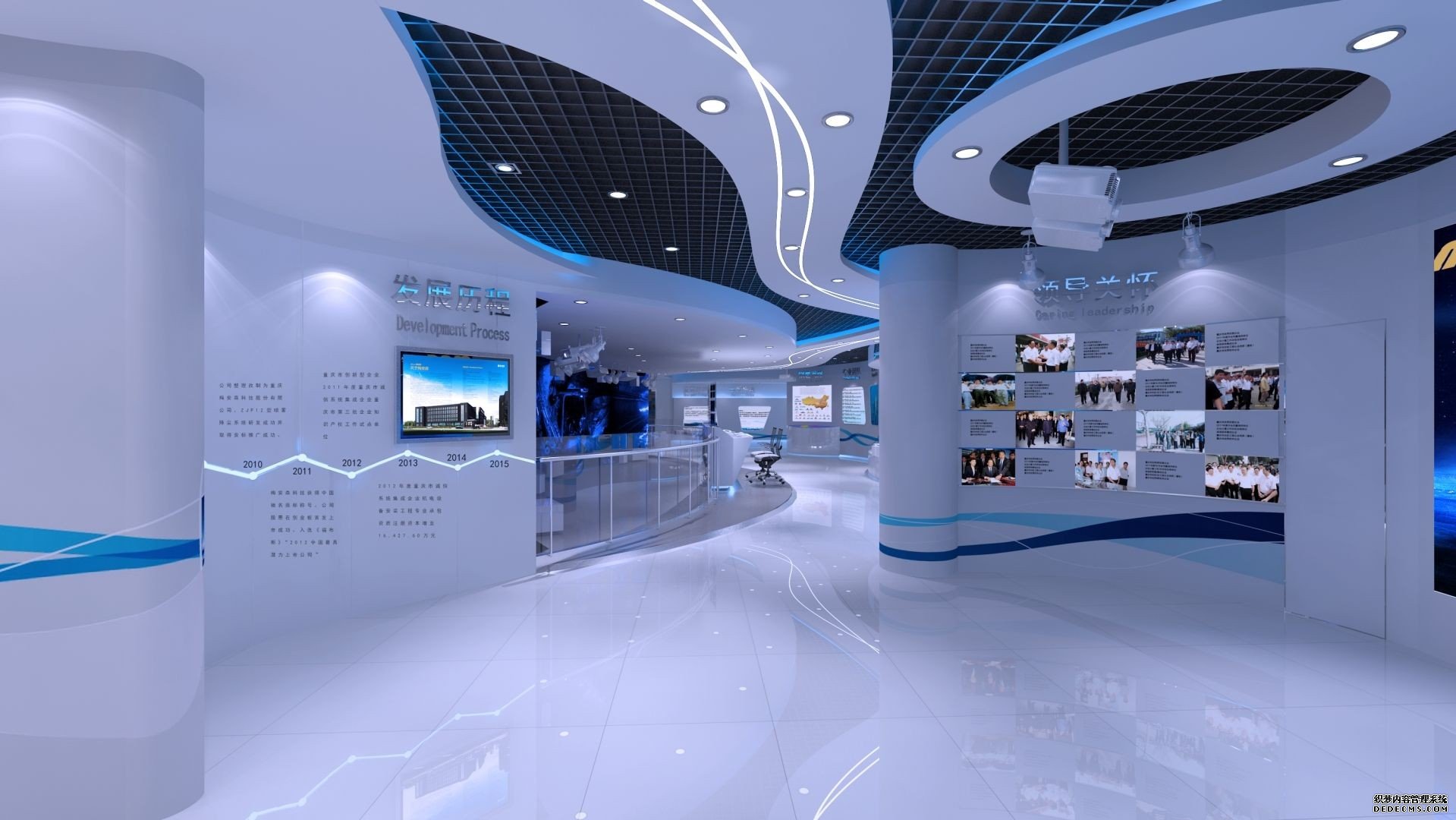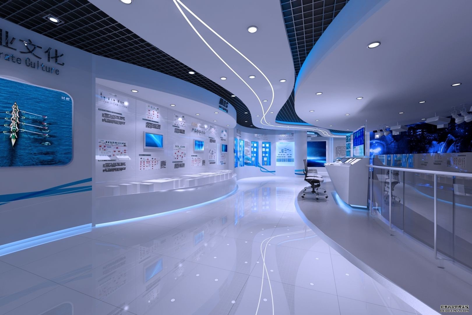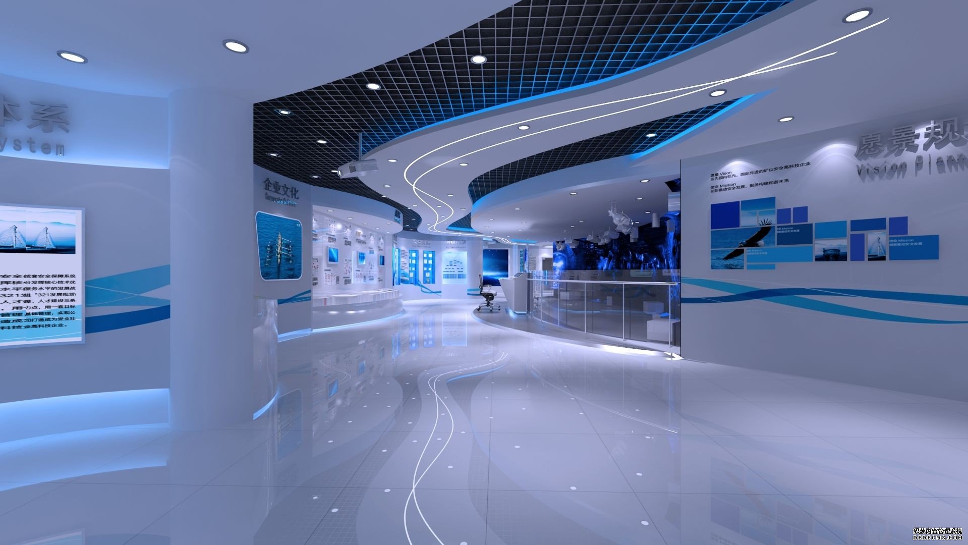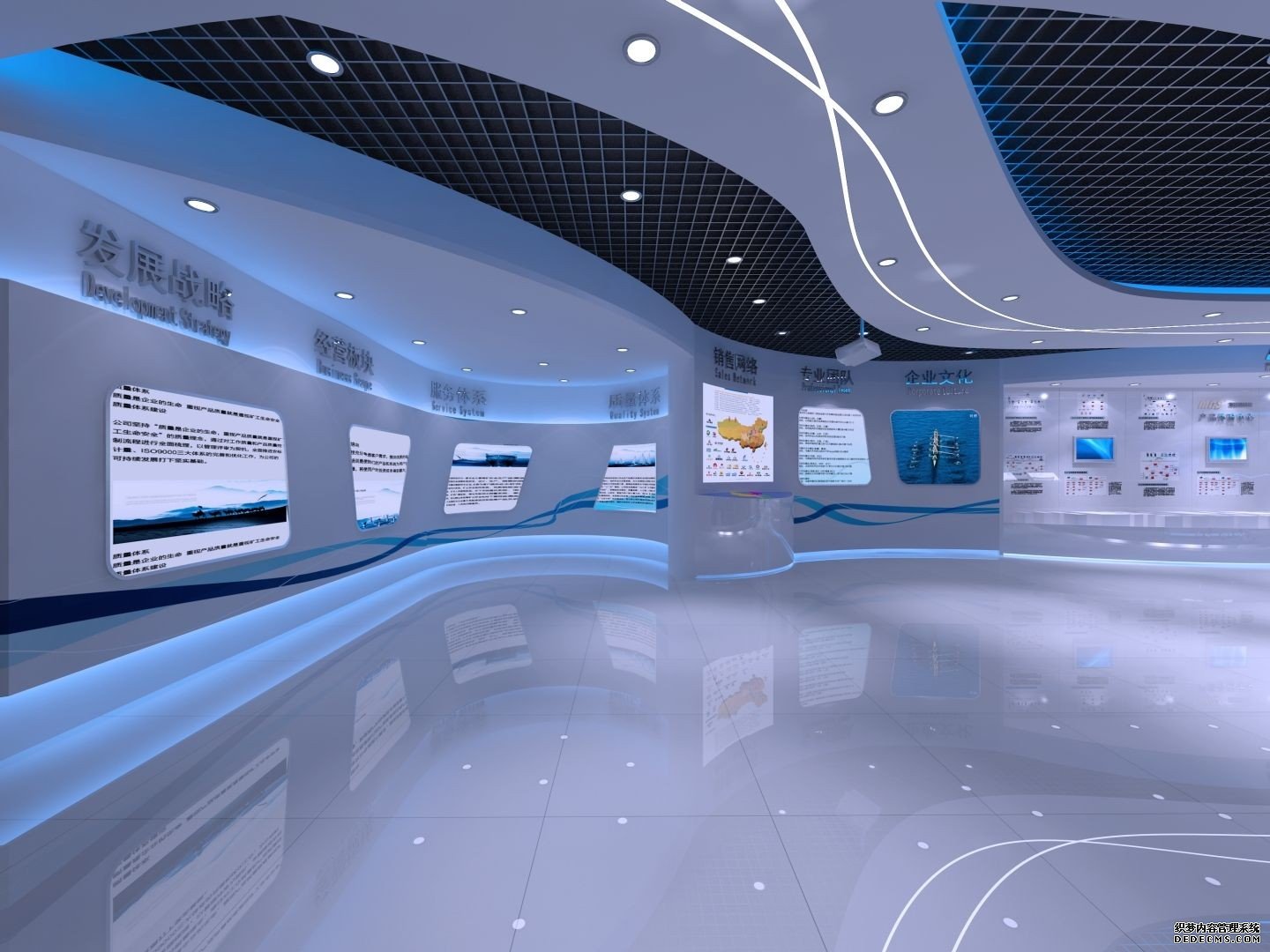 展厅主要展示企业的发展、文化、科研成果、组织机构,突出企业的实力,整个展厅以布局合理性、整体艺术性、手段综合化的展示风格、以科学的空间规划、准确的艺术表现、多层次传播手段的表现手法为基础,注重互动参与与展项的设计。整体色调以白色、蓝色为主,体现一种大气的空间感,结合互动展示设备可以使整个展厅更加赋有生命力和创造力。