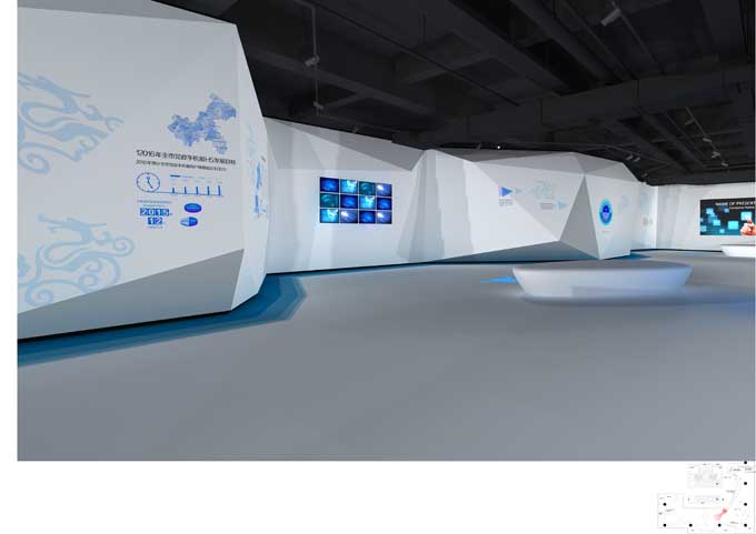 展馆设计以简洁为主,突出互联网属性,重视装饰与内容相结合,采用现代的科技互动的展示手段,重视声光电与艺术空间的环境营造。